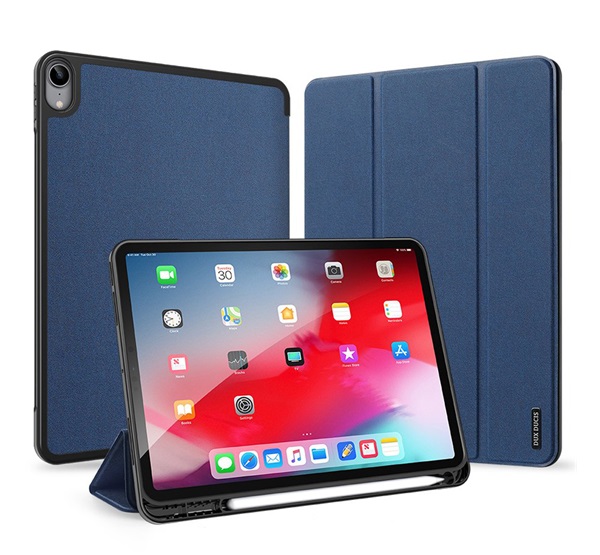 DUX DUCIS DOMO tok álló, bőr hatású (aktív FLIP, oldalra nyíló, TRIFOLD, Apple Pencil tartó, textil minta) SÖTÉTKÉK Apple IPAD Air 2020 (Air 4) Apple IPAD Air 2022