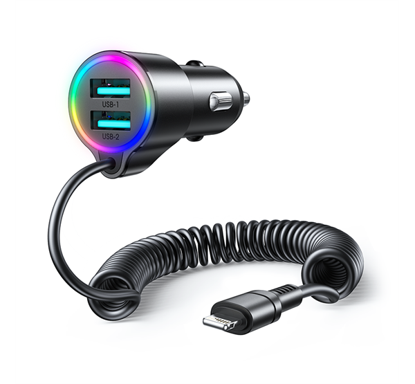 JOYROOM autós töltő 2 USB aljzat (17W, PD gyorstöltő 5.0 + fix lightning kábel) FEKETE