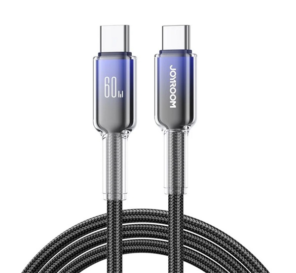 JOYROOM CRYSTAL-CLEAR adatkábel (Type-C - Type-C, 60W, gyorstöltő, 120cm, cipőfűző) FEKETE