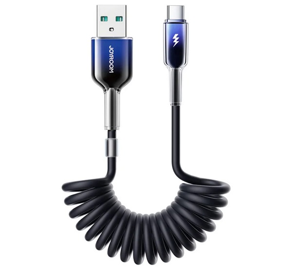 JOYROOM CRYSTAL-CLEAR adatkábel (USB - Type-C, 3A, gyorstöltő, 150cm, spirálkábel) FEKETE