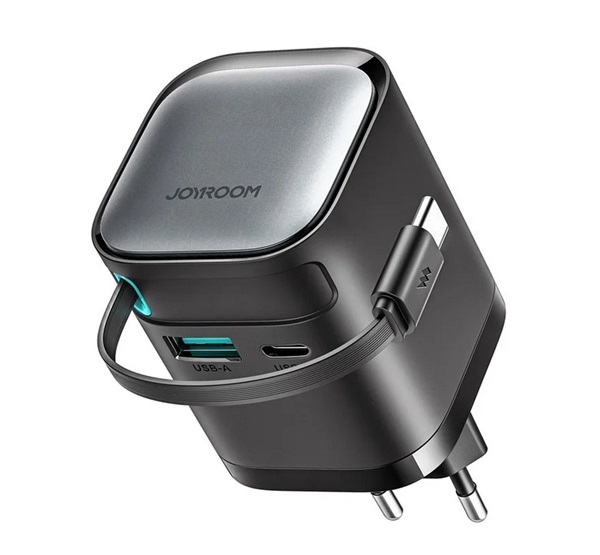 JOYROOM hálózati töltő USB+Type-C aljzat (65W, PD gyorstöltő, GaN + fix, csévélhető Type-C kábel) FEKETE