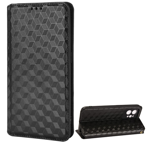 Realme GT2 Pro 5G Tok álló, bőr hatású (FLIP, oldalra nyíló, asztali tartó funkció, teljes 3D rombusz minta, prémium) FEKETE