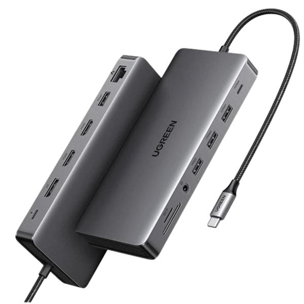 13 az 1-ben csatlakozási lehetőség: Sokoldalú hub dupla HDMI-vel, DisplayPorttal, 100W-os PD töltéssel, nagysebességű USB-C és USB-A portokkal, Ethernettel, SD/TF kártyahelyekkel és audiocsatlakozóval.