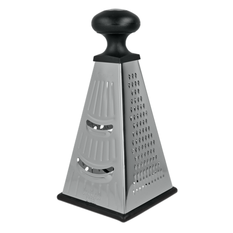 • Univerzális, négy oldalú, csúszásmentes szilikon aljú reszelő rozsdamentes acélból, a tetején fogóval.
